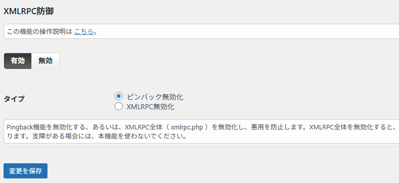 先ほど解説した通り、初期状態ではXMLRPCの一部機能である「ピンバック無効化(Pingback機能)」となっています。全てを無効化したい場合は「XMLRPC無効化」を選択します。サイト運営上で不都合が生じてXMLRPC自体を有効化したい場合は機能自体を「無効」にし、「変更を保存」をクリックします。