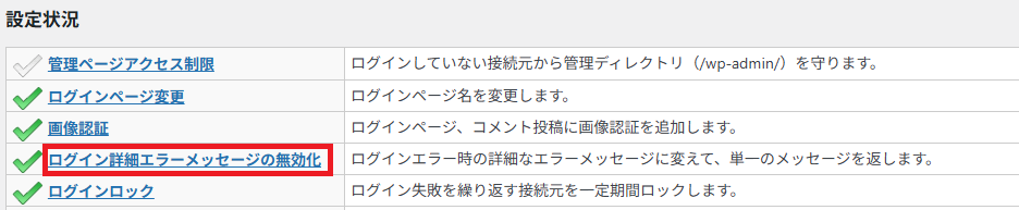 ログイン詳細エラーメッセージとは、ログインに失敗した際、間違っているのがログインID(ユーザ名やメールアドレス)かパスワード、または両方なのかをお知らせする機能です。この機能を無効化することでエラーメッセージを一律で次の画像のように表示することができます。「有効化」で無効化する機能が働くので設定は変更しないでください。
