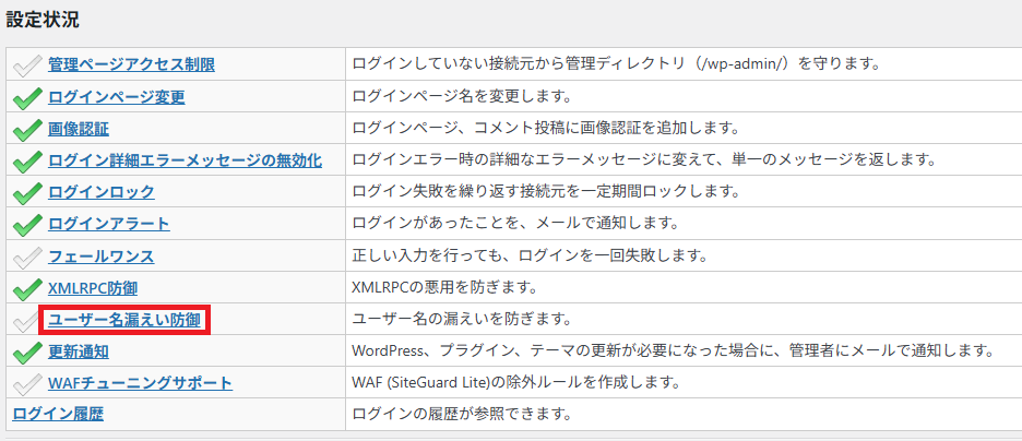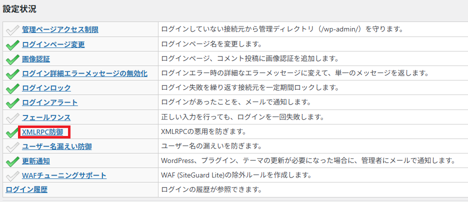 初期状態では「有効化」となっていますが、本プラグインではXMLRPCの機能の一部である「Pingback機能」のみを無効化する設定となっています。XMLRPC全体を無効化して不正アクセスの可能性をなるべく減らすこともできますが、当然デメリットもあるのでサイト上で外部アプリと連携する機能がある場合は注意しましょう。