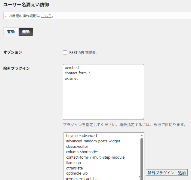 「除外プラグイン 追加」をクリックすることで無効化の対象から除外されます。