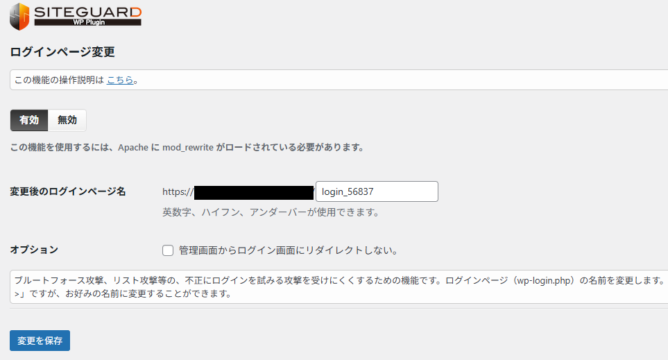 ここに記載のある「リダイレクト」とは、上記の初期URLを直接入力した時にログインページが変更されている場合、自動的にログインページに飛ぶことのできる機能です。ログインページをどれだけ変更してもリダイレクトした場合、一発でログインページがバレます。なので絶対にチェックを入れてください。