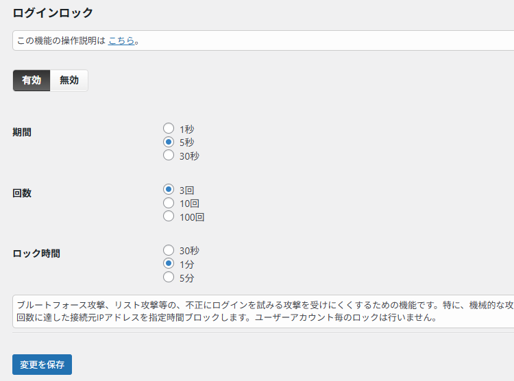 初期状態では「5秒」が設定されているので、「5秒以内の連続ログイン」を制限します。