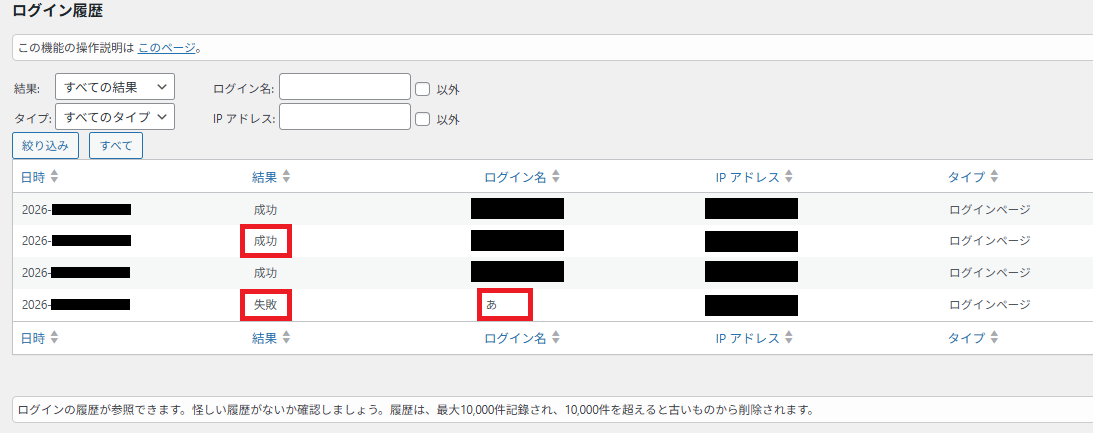 | 結果 | ログイン結果が「成功」または「失敗」で表示されます。 |