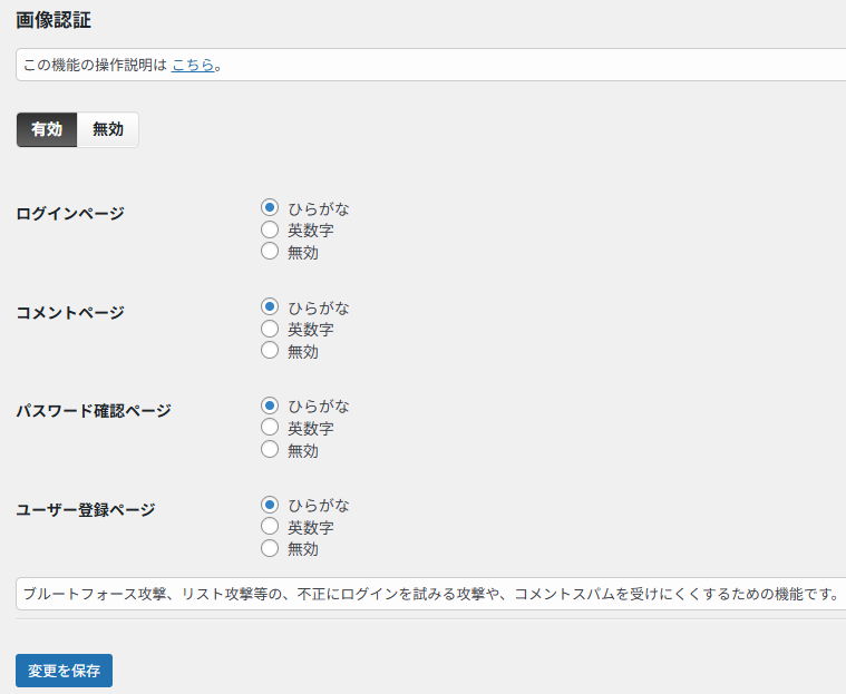 画像認証は「ひらがな」または「英数字」から選択することができます。